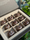 Väljer du denna ask får du 9st av våra kanelbullar i chokladkostym! Den är dessutom glutenfri för dig som annars tvingas hoppa denna läckra dag.